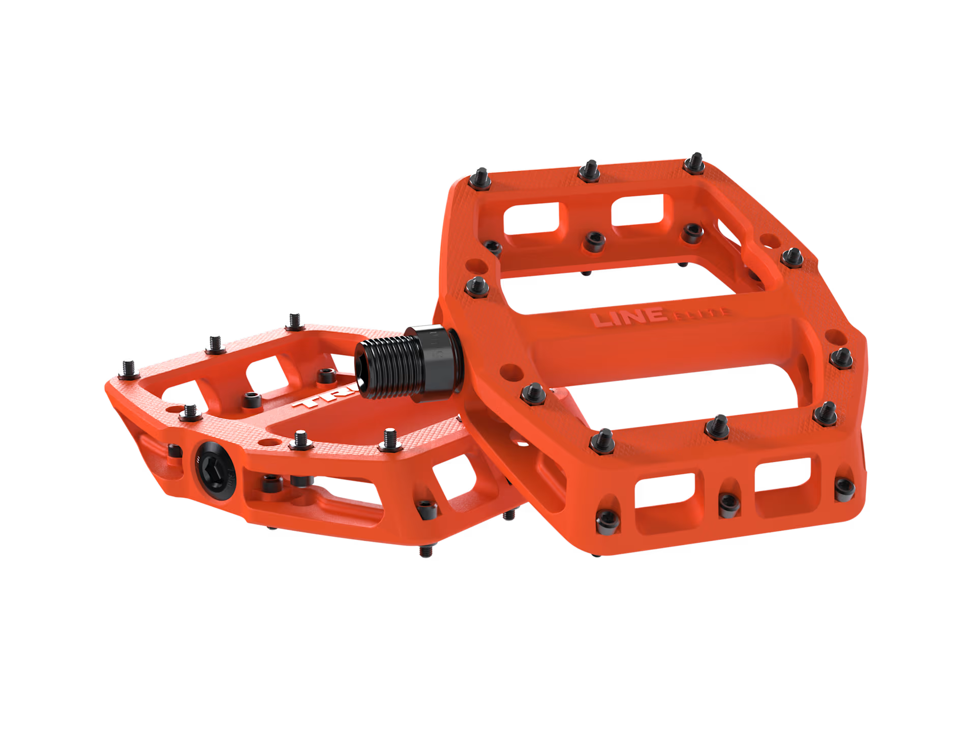 Pedales de plataforma con diseño de nailon resistente y pines reemplazables para un agarre más uniforme.
